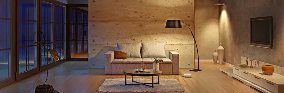 Im Innenbereich Ihres Heims sollten Sie darauf achten, welche Atmosphäre im jeweiligen Raum kreiert werden soll. Im Schlafzimmer ist eine angenehme Farbtemperatur von < 2.700 Kelvin optimal, da das Licht extra warmweiß ist und zum Entspannen einlädt. Eine warmweiße Farbtemperatur (2.700 bis 3.300 Kelvin) kann beispielsweise im Wohnzimmer genutzt werden. Achten Sie in jedem Fall auf eine hohe Farbwiedergabe ( > 90 Ra), damit angestrahlte Farben natürlich und nicht etwa matt oder glanzlos wirken. Das ist besonders in der Küche wegen der Lebensmittel wichtig. Es reicht aus, in jedem Raum eine Grundbeleuchtung zu haben, die mit dem Hauptlichtschalter verbunden ist. Allerdings kann auch eine Zonenbeleuchtung ein angenehmes Ambiente erzeugen, da das Licht beispielsweise einer Stehlampe nur in ihrem Bereich breitflächig den Teil des Raumes erhellt.