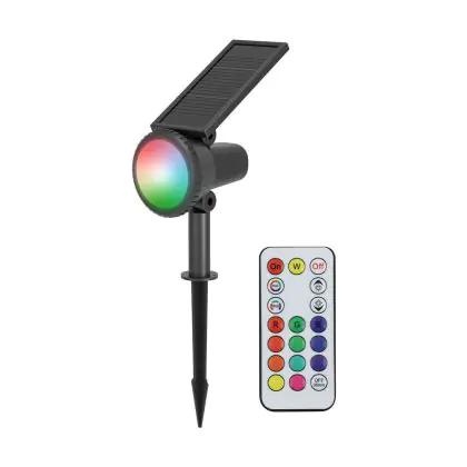Die Eglo Erdspießleuchte Sambuco Schwarz 3W 230lm - 830 Warmweiß | IP54 - Dimmbar ist eine moderne LED-Solarleuchte, welche Licht in der Farbtemperatur 3000K - Warmweiß + RGB ausstrahlt und mit einer langen Lebensdauer punktet. Die Leuchte benötigt keinen Strom, stattdessen wird die Energie der Sonne genutzt.