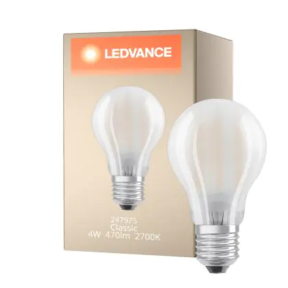 Die Ledvance Classic LED E27 Birne Fadenlampe Matt 4W 470lm - 827 Extra Warmweiß | Ersatz für 40W ist eine effiziente E27 LED-Lampe mit Retrodesign und der perfekte Ersatz für Ihre konventionellen 40W Lampen mit E27. Zudem strahlt sie Licht in der Farbtemperatur 2700K - Extra Warmweiß aus und punktet durch eine lange Lebensdauer.