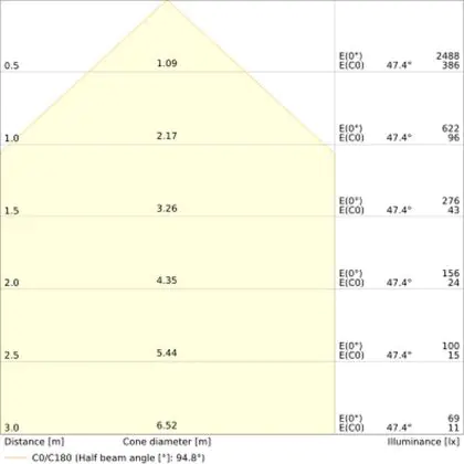 Der Abstrahlwinkel bezeichnet den Winkel, in dem das Licht aus der Lichtquelle ausgestrahlt wird. Er wird in Grad (D) angegeben. Je geringer die Gradzahl des Abstrahlwinkels ist, desto kleiner ist auch der Durchmesser des Lichtkegels, den die Lichtquelle produziert. Beispiel: Wird eine Lampe mit einem Abstrahlwinkel von 60 Grad an der Decke (2,5 m Höhe) angebracht, erzeugt sie einen Lichtkegel von 2,9 Metern Durchmesser. Hat die Lampe hingegen einen Abstrahlwinkel von 120 Grad, beträgt der Lichtkegel 8,7 Meter im Durchmesser. |