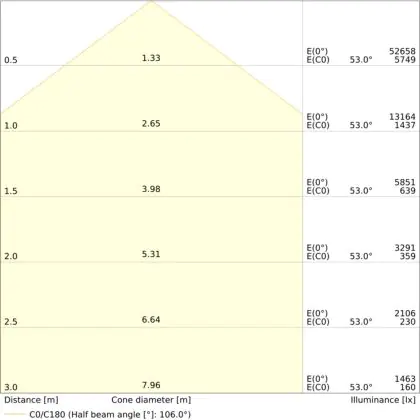 Der Abstrahlwinkel bezeichnet den Winkel, in dem das Licht aus der Lichtquelle ausgestrahlt wird. Er wird in Grad (D) angegeben. Je geringer die Gradzahl des Abstrahlwinkels ist, desto kleiner ist auch der Durchmesser des Lichtkegels, den die Lichtquelle produziert. Beispiel: Wird eine Lampe mit einem Abstrahlwinkel von 60 Grad an der Decke (2,5 m Höhe) angebracht, erzeugt sie einen Lichtkegel von 2,9 Metern Durchmesser. Hat die Lampe hingegen einen Abstrahlwinkel von 120 Grad, beträgt der Lichtkegel 8,7 Meter im Durchmesser. |