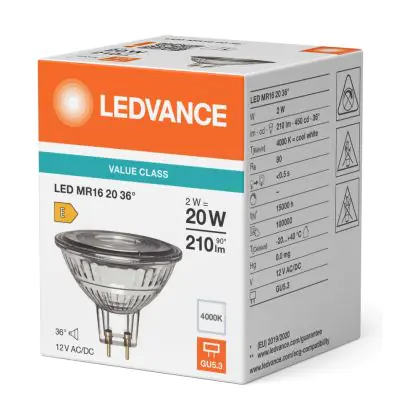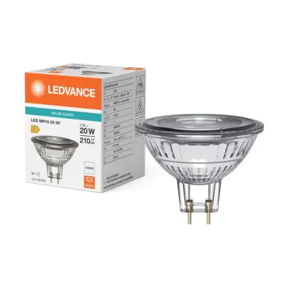 Die Ledvance LED MR16 P LED Reflektor GU5.3 PAR16 2W 210lm 36d - 830 Warmweiß| Ersatz Für 20w ist eine effiziente GU5.3 LED-Lampe und der perfekte Ersatz für Ihre konventionelle Halogenlampe mit 20W und einem GU5.3-Sockel, bei dem die beiden Stifte einen Abstand von 5,3 mm zueinander haben. Die Abkürzung MR16 zeigt Ihnen, dass der Reflektor einen Durchmesser von 5 cm hat. Zudem strahlt das Produkt Licht in der Farbtemperatur aus und punktet durch eine lange Lebensdauer.