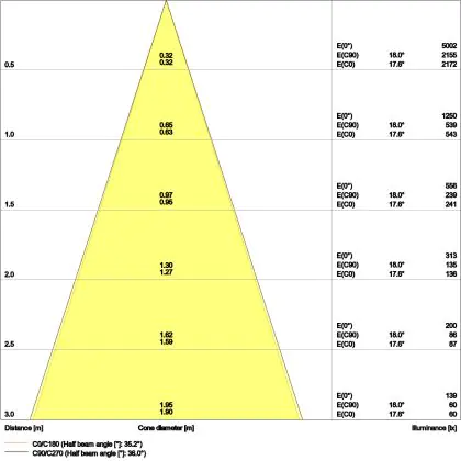 Der Abstrahlwinkel bezeichnet den Winkel, in dem das Licht aus der Lichtquelle ausgestrahlt wird. Er wird in Grad (D) angegeben. Je geringer die Gradzahl des Abstrahlwinkels ist, desto kleiner ist auch der Durchmesser des Lichtkegels, den die Lichtquelle produziert. Beispiel: Wird eine Lampe mit einem Abstrahlwinkel von 60 Grad an der Decke (2,5 m Höhe) angebracht, erzeugt sie einen Lichtkegel von 2,9 Metern Durchmesser. Hat die Lampe hingegen einen Abstrahlwinkel von 120 Grad, beträgt der Lichtkegel 8,7 Meter im Durchmesser. |