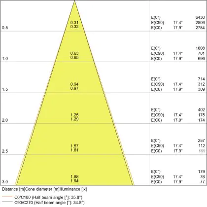 Der Abstrahlwinkel bezeichnet den Winkel, in dem das Licht aus der Lichtquelle ausgestrahlt wird. Er wird in Grad (D) angegeben. Je geringer die Gradzahl des Abstrahlwinkels ist, desto kleiner ist auch der Durchmesser des Lichtkegels, den die Lichtquelle produziert. Beispiel: Wird eine Lampe mit einem Abstrahlwinkel von 60 Grad an der Decke (2,5 m Höhe) angebracht, erzeugt sie einen Lichtkegel von 2,9 Metern Durchmesser. Hat die Lampe hingegen einen Abstrahlwinkel von 120 Grad, beträgt der Lichtkegel 8,7 Meter im Durchmesser. |