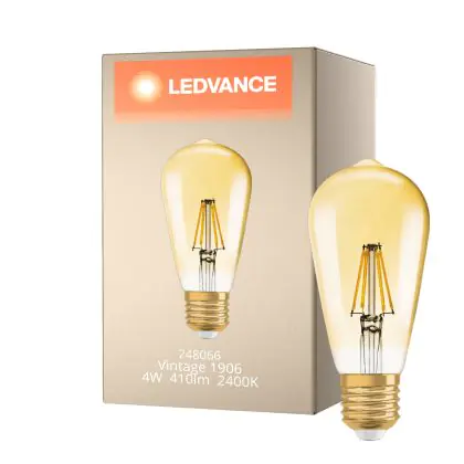 Die Ledvance Vintage 1906 LED E27 Birne Gold 4W 410lm - 824 Extra Warmweiß | Ersatz für 35W ist eine effiziente E27 LED-Lampe mit Retrodesign und der perfekte Ersatz für Ihre konventionellen 35W Lampen mit E27. Zudem strahlt sie Licht in der Farbtemperatur 2400K - Extra Warmweiß aus und punktet durch eine lange Lebensdauer.