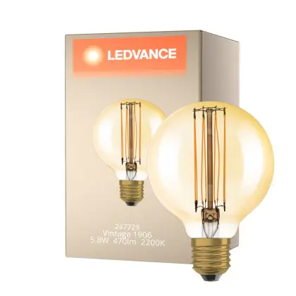 Die Ledvance Vintage 1906 LED E27 Globe Gold 5.8W 470lm - 822 Extra Warmweiß | Dimmbar - Ersatz für 40W ist eine effiziente E27 LED-Lampe mit Retrodesign und der perfekte Ersatz für Ihre konventionellen 40W Lampen mit E27. Zudem strahlt sie Licht in der Farbtemperatur 2200K - Extra Warmweiß aus und punktet durch eine lange Lebensdauer.