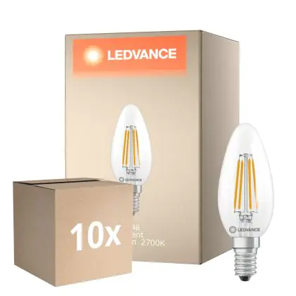 Die Mehrfachpackung 10x Ledvance Classic LED E14 Kerze Fadenlampe Klar 3.4W 470lm - 827 Extra Warmweiß | Ersatz Für 40W ist eine effiziente E14 LED-Lampe mit Retrodesign und der perfekte Ersatz für Ihre konventionellen 40W Lampen mit E14. Zudem strahlt sie Licht in der Farbtemperatur aus und punktet durch eine lange Lebensdauer.