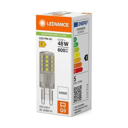 Die Mehrfachpackung 10x Ledvance LED Pin G9 Klar 4.5W 600lm - 840 Kaltweiß | Ersatz Für 48W ist eine effiziente G9 LED-Lampe und der perfekte Ersatz für Ihre konventionelle Halogenlampe mit W und einem G9-Sockel. Die Stifte haben einen Abstand von 9 mm. Zudem strahlt das Produkt Licht in der Farbtemperatur aus und punktet durch eine lange Lebensdauer.