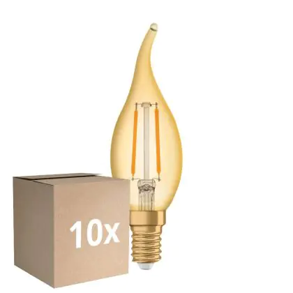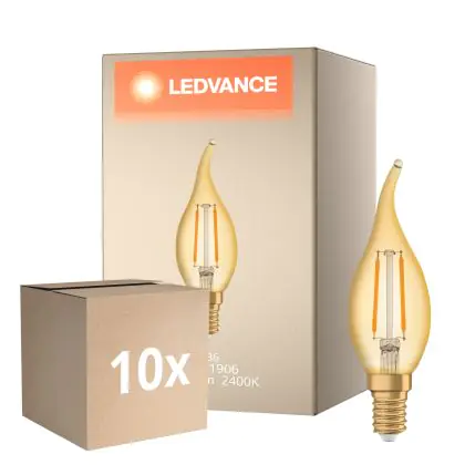Die Mehrfachpackung 10x Ledvance Vintage 1906 LED E14 Kerze Gold 2.5W 220lm - 824 Extra Warmweiß | Ersatz Für 22W ist eine effiziente E14 LED-Lampe mit Retrodesign und der perfekte Ersatz für Ihre konventionellen 22W Lampen mit E14. Zudem strahlt sie Licht in der Farbtemperatur aus und punktet durch eine lange Lebensdauer.