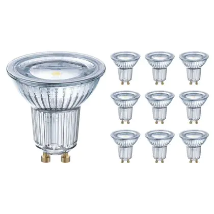 Die Mehrfachpackung 10x Osram Performance LED-Spot Reflektor GU10 PAR16 4.3W 350lm 120D - 827 Extra Warmweiß | Ersatz Für 30W ist eine effiziente GU10 LED-Lampe und der perfekte Ersatz für Ihre konventionelle Halogenlampe mit 30W und einem GU10-Sockel, bei welchem die zwei Stifte einen Abstand von 10 mm zueinander haben. Zudem strahlt das Produkt Licht in der Farbtemperatur 2700K - Extra Warmweiß aus und punktet durch eine lange Lebensdauer.