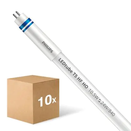 Die Mehrfachpackung 10x Philips LED Röhre T5 MASTER Instantfit (HF) High Output 10.5W 1600lm - 840 Kaltweiß | 55cm - Dimmbar - Ersatz Für 24W ist eine effiziente LED-Röhre und der perfekte Ersatz für Ihre konventionelle Leuchtstoffröhre mit 24W und einem G5. Die Röhre hat eine Länge von 563 mm und einen Durchmesser von 19 mm. Zudem strahlt das Produkt Licht in der Farbtemperatur 4000K - Kaltweiß aus und punktet durch eine lange Lebensdauer.