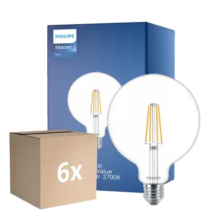 Die Mehrfachpackung 6x Philips MASTER Value LED Globe E27 120mm Fadenlampe Klar 5.9W 806lm - 927 Extra Warmweiß | Höchste Farbwiedergabe - Ersatz Für 60W ist eine effiziente E27 LED-Lampe mit Retrodesign und der perfekte Ersatz für Ihre konventionellen 60W Lampen mit E27. Zudem strahlt sie Licht in der Farbtemperatur 2700K - Extra Warmweiß aus und punktet durch eine lange Lebensdauer.