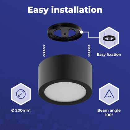Die Noxion LED Downlight Hera Oberflächenhalterung Schwarz 21W 2400lm 100D - 827-830-840 CCT | 200mm ist eine Feuchtraumleuchte. Sie strahlt Licht in der Farbtemperatur 2700K - 3000K - 4000K CCT aus und punktet durch eine lange Lebensdauer. Diese Leuchte ist speziell zur Verwendung in Feuchträumen (Keller, Waschräume, etc.) vorgesehen.