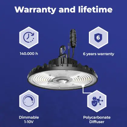 Wir von BeleuchtungDirekt haben mit der LED-Hallenleuchte von Noxion gute Erfahrungen gemacht. Daher bieten wir Ihnen für dieses Produkt eine Garantie von 6 Jahre an.