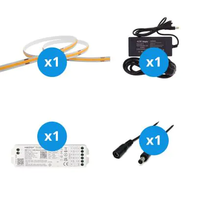 Der große Vorteil dieses Komplettsets ist, dass Sie alles Zubehör haben, das Sie benötigen, um die besten Lichtakzente für Ihr Zuhause oder Ihre Geschäftsräume zu setzen. Sie müssen nicht nach dem richtigen Zubehör suchen, sondern nur alle Elemente miteinander verbinden. Anschließend stecken Sie den Stecker in eine normale Steckdose in Ihrem Haus. Alles dazu erfahren Sie in unserem Installationsblog. Dieses Set enthält: