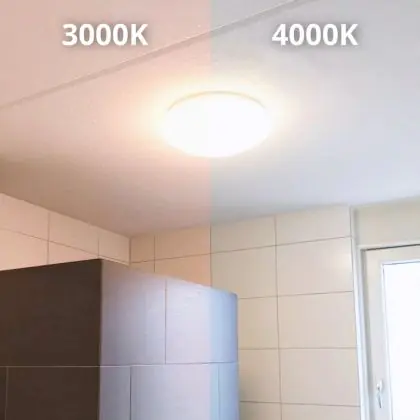Die LED-Feuchtraumleuchte kommt mit der Farbtemperatur 3000K - Warmweiß daher. Als Faustregel gilt: Je niedriger der Kelvinwert, desto gemütlicher wirkt das Licht.