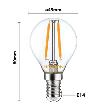| Herstellername | Noxion Lucent Filament LED Lustre P45 E14 220-240V 2.5W 250LM CRI80 2700K DIM (25W eqv.) | |