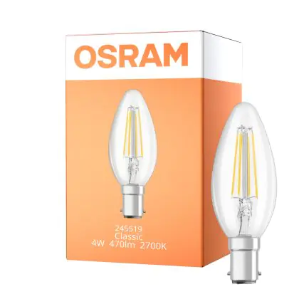 Die Osram Classic LED B15d Kerze Fadenlampe Klar 4W 470lm - 827 Extra Warmweiß | Ersatz für 40W ist eine effiziente B15d LED-Lampe mit Retrodesign und der perfekte Ersatz für Ihre konventionellen 40W Lampen mit B15d. Zudem strahlt sie Licht in der Farbtemperatur 2700K - Extra Warmweiß aus und punktet durch eine lange Lebensdauer.