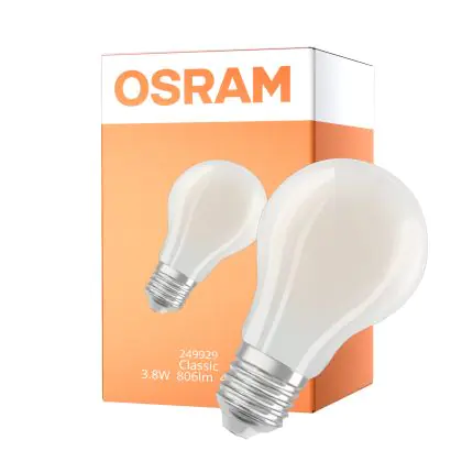 Die Osram Classic LED E27 Birne Fadenlampe Matt 3.8W 806lm - 840 Kaltweiß | Dimmbar - Ersatz Für 60W ist eine effiziente E27 LED-Lampe mit Retrodesign und der perfekte Ersatz für Ihre konventionellen 60W Lampen mit E27. Zudem strahlt sie Licht in der Farbtemperatur 4000K - Kaltweiß aus und punktet durch eine lange Lebensdauer.