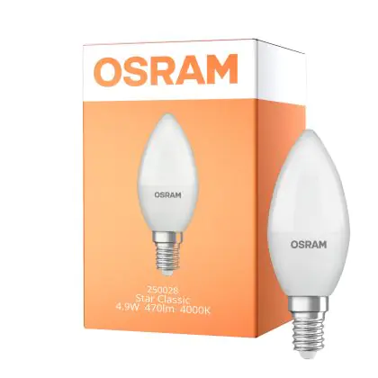 Die Osram LED Star Classic E14 Kerze Matt 4.9W 470lm - 840 Kaltweiß | Ersatz Für 40W ist eine effiziente E14 LED-Lampe und der perfekte Ersatz für Ihre konventionellen 40W Lampen mit E14-Sockel. Zudem strahlt sie Licht in der Farbtemperatur 4000K - Kaltweiß aus und punktet durch eine lange Lebensdauer.