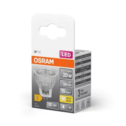 Der Parathom GU4 LED-Strahler von Osram kann nicht nur mit einer langen Lebensdauer von 15000 überzeugen, sondern kommt auch mit einer hohen Lumeneffizienz von lm/W daher. Aufgrund des weit verbreiteten GU4-Sockels kann er in vielen Bereichen verwendet werden. Im Kaufpreis ist zudem eine All-In-Garantie von 3 Jahre enthalten.