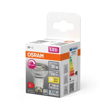 Die Osram LED Superstar Reflektor Spot GU10 PAR16 3.7W 230lm 36D - 927 Extra Warmweiß | Höchste Farbwiedergabe - Dimmbar - Ersatz Für 35W ist eine effiziente GU10 LED-Lampe und der perfekte Ersatz für Ihre konventionelle Halogenlampe mit 35W und einem GU10-Sockel, bei welchem die zwei Stifte einen Abstand von 10 mm zueinander haben. Zudem strahlt das Produkt Licht in der Farbtemperatur 2700K - Extra Warmweiß aus und punktet durch eine lange Lebensdauer.