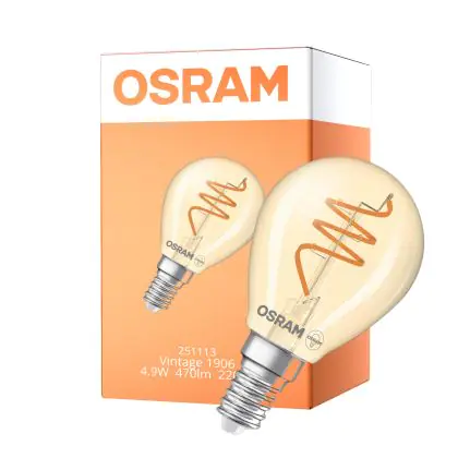 Die Osram Vintage 1906 LED Classic Slim E14 Birne Fadenlampe Gold 4.9W 470lm - 922 Extra Warmweiß | Höchste Farbwiedergabe - Dimmbar - Ersatz Für 40W ist eine effiziente E14 LED-Lampe mit Retrodesign und der perfekte Ersatz für Ihre konventionellen 40W Lampen mit E14. Zudem strahlt sie Licht in der Farbtemperatur 2200K - Extra Warmweiß aus und punktet durch eine lange Lebensdauer.