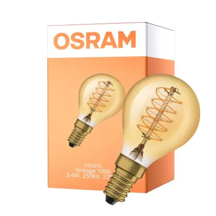 Die Osram Vintage 1906 LED E14 Ball Filament Gold 3.4W 250lm - 822 Extra Warm White | Dimmable ist eine effiziente E14 LED-Lampe mit Retrodesign und der perfekte Ersatz für Ihre konventionellen 25W Lampen mit E14. Zudem strahlt sie Licht in der Farbtemperatur 2200K - Extra Warmweiß aus und punktet durch eine lange Lebensdauer.