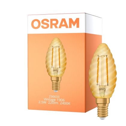 Die Osram Vintage 1906 LED E14 Gedreht Kerze Fadenlampe Gold 2.5W 220lm - 824 Extra Warmweiß | Ersatz für 25W ist eine effiziente E14 LED-Lampe mit Retrodesign und der perfekte Ersatz für Ihre konventionellen 25W Lampen mit E14. Zudem strahlt sie Licht in der Farbtemperatur 2400K - Extra Warmweiß aus und punktet durch eine lange Lebensdauer.