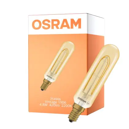 Die Osram Vintage 1906 LED Special Shapes E14 Tubular Messing 4.8W 420lm - 822 Extra Warmweiß | Dimmbar - Ersatz Für 40W ist eine effiziente E14 LED-Lampe mit Retrodesign und der perfekte Ersatz für Ihre konventionellen 40W Lampen mit E14. Zudem strahlt sie Licht in der Farbtemperatur 2200K - Extra Warmweiß aus und punktet durch eine lange Lebensdauer.