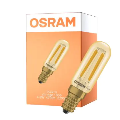 Die Osram Vintage 1906 LED Special Shapes E14 Tubular Messing 4.8W 470lm - 822 Extra Warmweiß | Dimmbar - Ersatz Für 40W ist eine effiziente E14 LED-Lampe mit Retrodesign und der perfekte Ersatz für Ihre konventionellen 40W Lampen mit E14. Zudem strahlt sie Licht in der Farbtemperatur 2200K - Extra Warmweiß aus und punktet durch eine lange Lebensdauer.