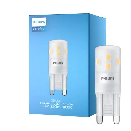 Die Philips CorePro LED Capsule G9 Matt 1.9W 220lm - 830 Warmweiß | Ersatz Für 25W ist eine effiziente G9 LED-Lampe und der perfekte Ersatz für Ihre konventionelle Halogenlampe mit 25W und einem G9-Sockel. Die Stifte haben einen Abstand von 9 mm. Zudem strahlt das Produkt Licht in der Farbtemperatur 3000K - Warmweiß aus und punktet durch eine lange Lebensdauer.