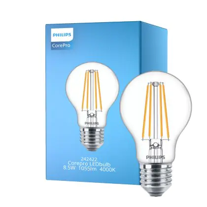Die Philips Corepro LED Glühbirne E27 Birne Klar 8.5W 1055lm - 840 Kaltweiß | Ersatz für 75W ist eine effiziente E27 LED-Lampe und der perfekte Ersatz für Ihre konventionellen 75W Lampen mit E27-Sockel. Zudem strahlt sie Licht in der Farbtemperatur 4000K - Kaltweiß aus und punktet durch eine lange Lebensdauer.