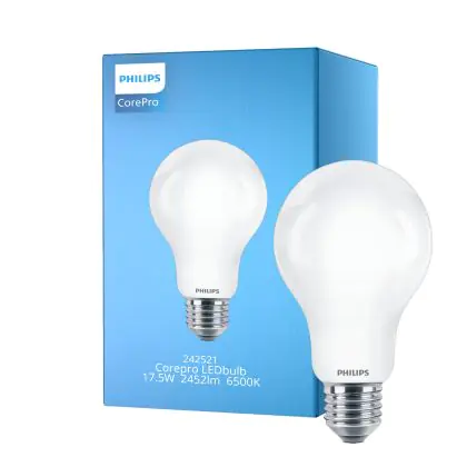 Die Philips Corepro LED Glühbirne E27 Birne Matt 17.5W 2452lm - 865 Tageslichtweiß | Ersatz für 150W ist eine effiziente E27 LED-Lampe und der perfekte Ersatz für Ihre konventionellen 150W Lampen mit E27-Sockel. Zudem strahlt sie Licht in der Farbtemperatur 6500K - Tageslichtweiß aus und punktet durch eine lange Lebensdauer.