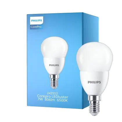 Die Philips Corepro LED Lustre E14 Kugel Matt 7W 806lm - 865 Tageslichtweiß | Ersatz für 60W ist eine effiziente E14 LED-Lampe und der perfekte Ersatz für Ihre konventionellen 60W Lampen mit E14-Sockel. Zudem strahlt sie Licht in der Farbtemperatur 6500K - Tageslichtweiß aus und punktet durch eine lange Lebensdauer.