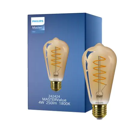 Die Philips MASTER Value LED Glühbirne E27 Edison Fadenlampe Gold 4W 250lm - 818 Extra Warmweiß | Dimmbar - Ersatz Für 25W ist eine effiziente E27 LED-Lampe mit Retrodesign und der perfekte Ersatz für Ihre konventionellen 25W Lampen mit E27. Zudem strahlt sie Licht in der Farbtemperatur 1800K - Extra Warmweiß aus und punktet durch eine lange Lebensdauer.